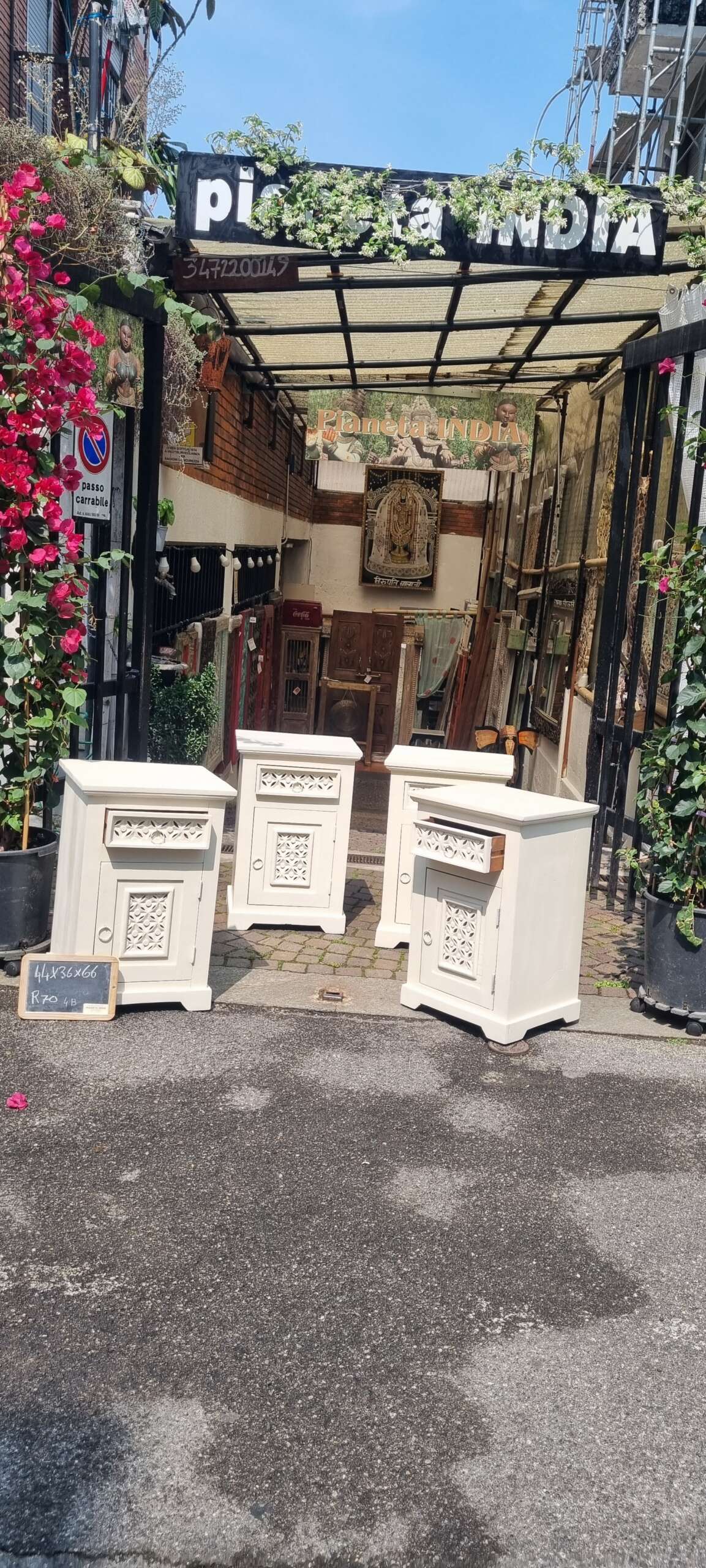 Elegante comodino in legno di teak laccato color crema, arricchito da dettagli intagliati su cassetto e anta. La lavorazione artigianale evidenzia la qualità del prodotto, perfetto per ambienti dallo stile boho, etnico o shabby chic. Pratico e raffinato, unisce estetica e funzionalità in spazi notte o angoli relax.