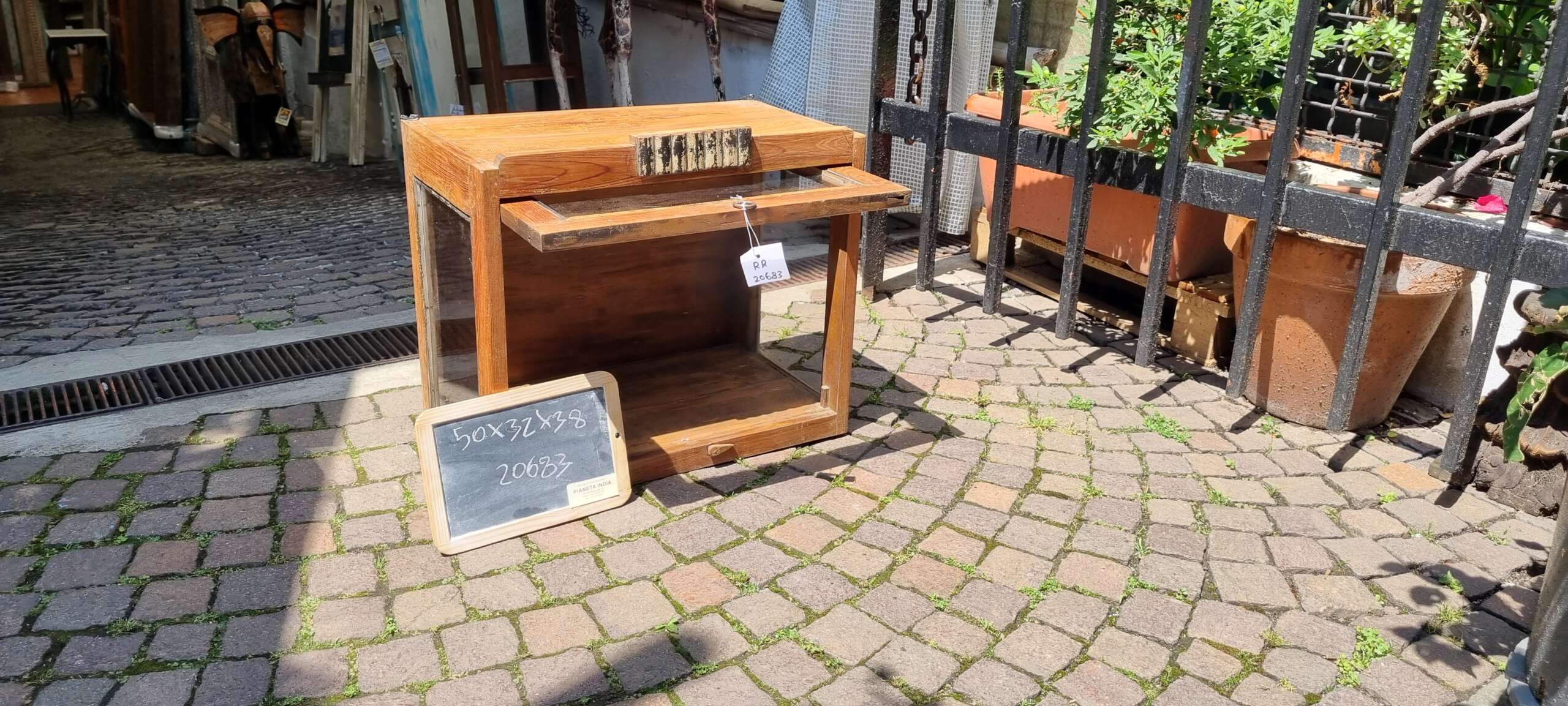 Compatta vetrinetta da appoggio in legno di teak, con ampia anta frontale in vetro dotata di apertura basculante. La finitura naturale e la maniglia decorativa le conferiscono un look sobrio e versatile. Ideale per valorizzare piccoli oggetti o collezioni in salotti, corridoi o ambienti di lavoro.