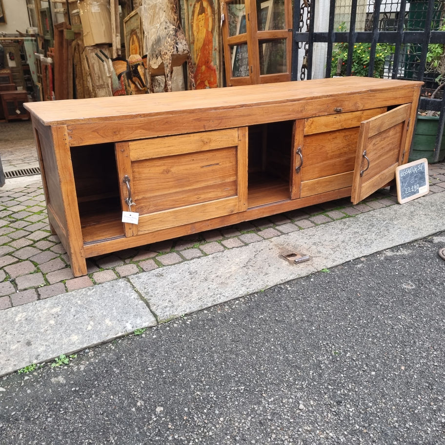 Splendido mobiletto in stile coloniale realizzato in legno massello dalle tonalità calde e naturali. Le ante presentano un elegante design a pannelli multipli con maniglie in metallo, caratteristico dell'estetica vintage. Perfetto per arredamenti etnici e rustico-chic, combina funzionalità e fascino d'epoca in un mobile versatile e robusto.