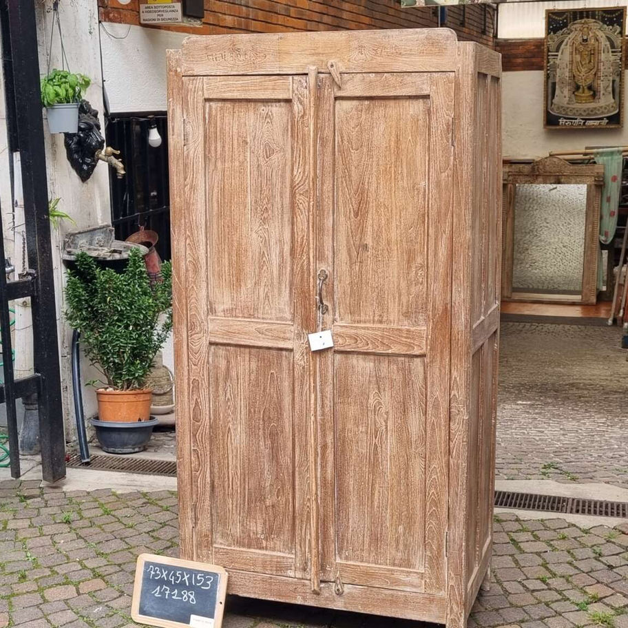 Armadio in teak naturale con finitura grezza e venature ben evidenti, ideale per ambienti rustici o industriali. Questo armadio in legno di teak si distingue per la sua struttura essenziale e le venature naturali messe in risalto da una finitura grezza. Dotato di due ante con pannellatura semplice e una serratura centrale, è perfetto per chi cerca un mobile contenitore funzionale e dallo stile autentico. Ideale per camere, corridoi o spazi dallo stile rustico, country o industriale.