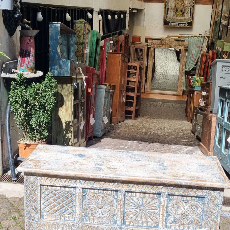 Bauletto in teak con intagli geometrici e finitura decapata. \n \nLe sue misure contenute permettono di utilizzarlo anche come tavolino salvaspazio davanti al divano. \n \nI colori tenui e delicati lo rendono un pezzo d'arredo unico nel suo genere. Baule in teak finemente intagliato con motivi geometrici e floreali, caratterizzato da una colorazione decapata blu e avorio. Perfetto come elemento decorativo e contenitore per coperte, cuscini o oggetti personali.