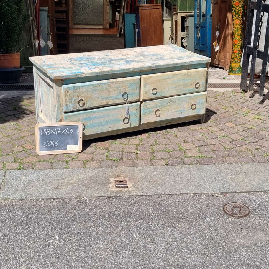 Cassettiera in teak con quattro ampi cassetti e finitura shabby dal colore prevalentemente verdognolo. \n \nFacilmente inseribile per le sue ridotte dimensioni puo'essere usato anche come tavolino davanti al divano.I suoi ampi cassetti lo rendono molto funzionale.Le maniglie sono costituite da pratici anelli in ferro ma possono essere anche sostituite da maniglie in ottone. \n \nParadossalmente con un bel cuscino sopra puo'diventare anche una comoda e decorativa panchetta. Cassettiera in legno di teak composta da quattro cassetti frontali. La finitura shabby con toni azzurro e crema conferisce al mobile un aspetto vissuto e affascinante, ideale per ambienti dallo stile boho o marinaro.