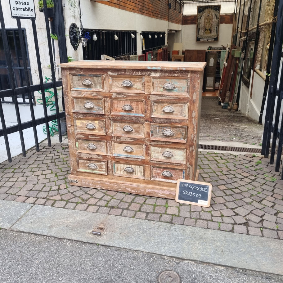 Affascinante cassettiera in stile coloniale realizzata in legno massello con finitura naturale invecchiata. Dotata di 15 cassetti disposti su tre colonne, ciascuno con eleganti maniglie in metallo a conchiglia. Un pezzo autentico che combina funzionalità e fascino vintage, perfetto per aggiungere carattere e storage generoso a qualsiasi ambiente.