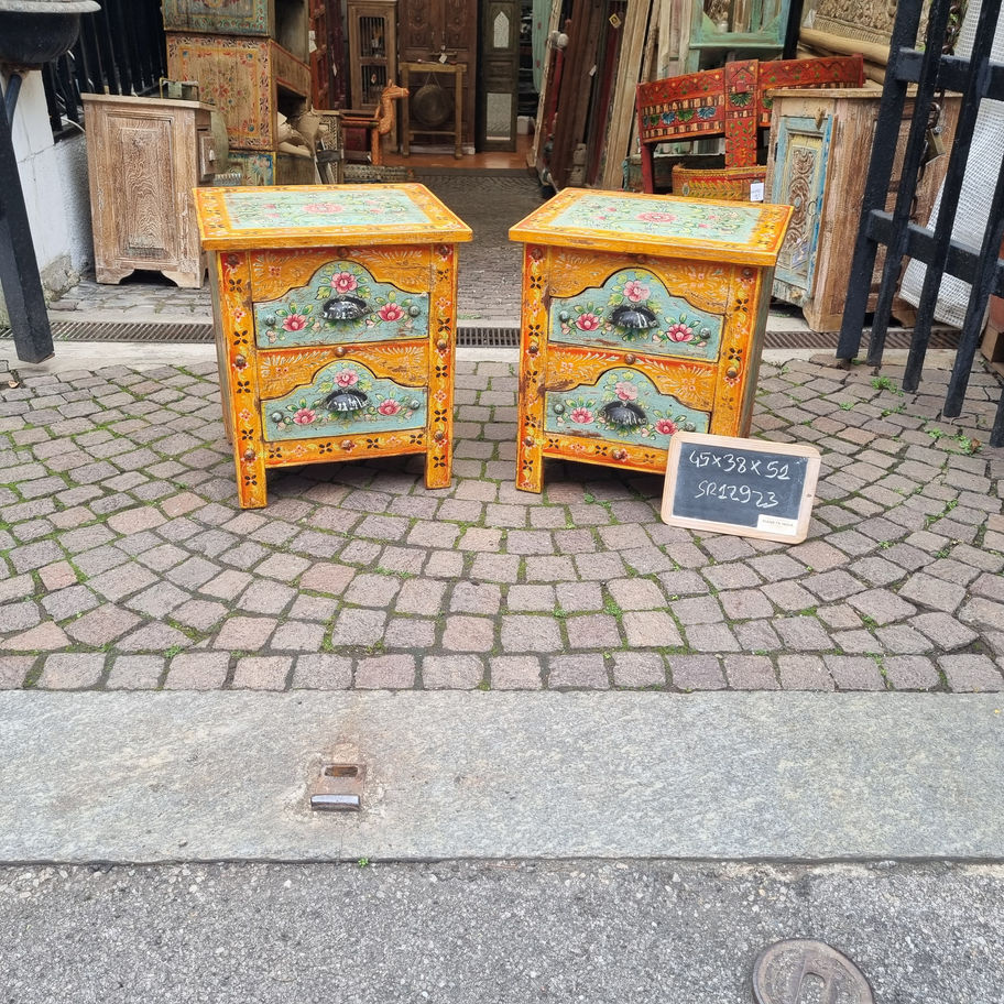 Comodino robusto in legno massello con tre cassetti impreziositi da intagli geometrici. La tonalità calda del legno valorizza ogni ambiente notte. Misure: 45X38X51 cm.