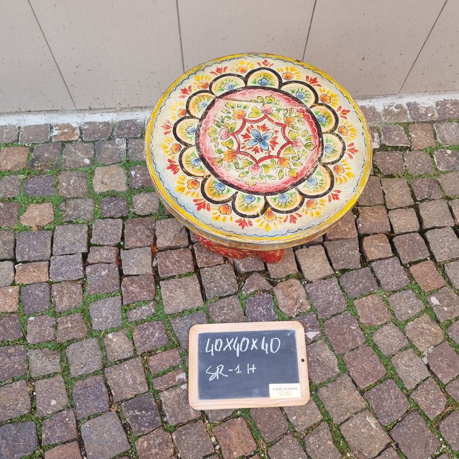 Bellissimo sgabello basso di colore rosso con decorazioni multicolor e base a forma di elefante