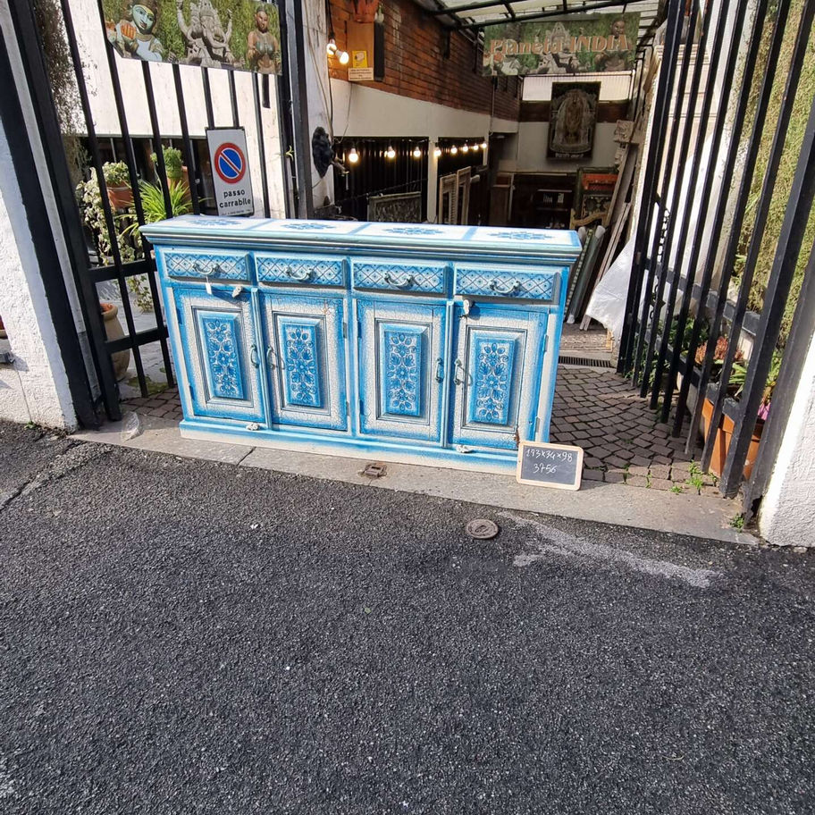 Questa è una bella credenza, particolare, con un effetto di lavorazione craquele, effetto screpolato ottenuto con una particolare lavorazione. \n \nHa quattro ante con disegni floreali sempre artigianali con ripiani interni. Comodi i quattro cassetti con una bella maniglia.