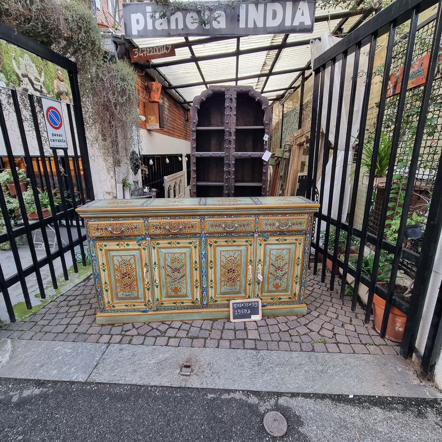 Affascinante credenza in stile etnico indiano, caratterizzata da un elegante finitura azzurra che crea un contrasto suggestivo con i dettagli decorativi dorati del ripiano superiore. Il mobile presenta due ante in legno che si aprono su scaffali interni, due cassetti decorati con motivi floreali tradizionali e una decorazione centrale con elementi geometrici e colorati tipici dell'artigianato indiano. Una scelta originale per chi desidera aggiungere carattere e autenticità all'ambiente.