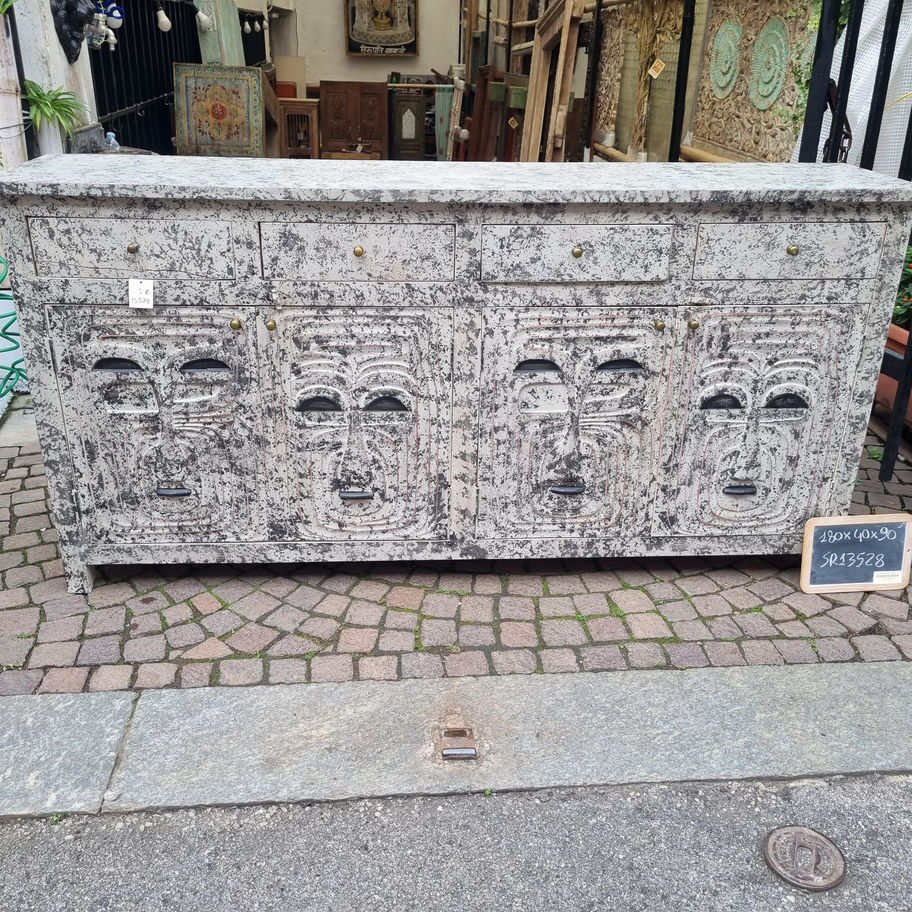 Affascinante credenza in stile etnico-coloniale, caratterizzata da un'originale decorazione a bassorilievo con volti scolpiti sulla facciata. Realizzata in legno massiccio con finitura bianca invecchiata, presenta dettagli decorativi di grande impatto e due vani di capienza con maniglie in ottone. Un pezzo versatile e suggestivo, perfetto per chi ricerca elementi di arredamento con forte personalità e atmosfera vintage.