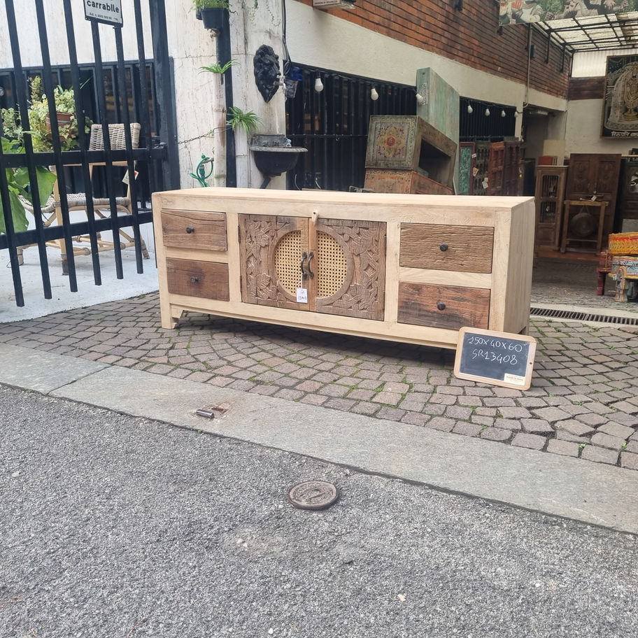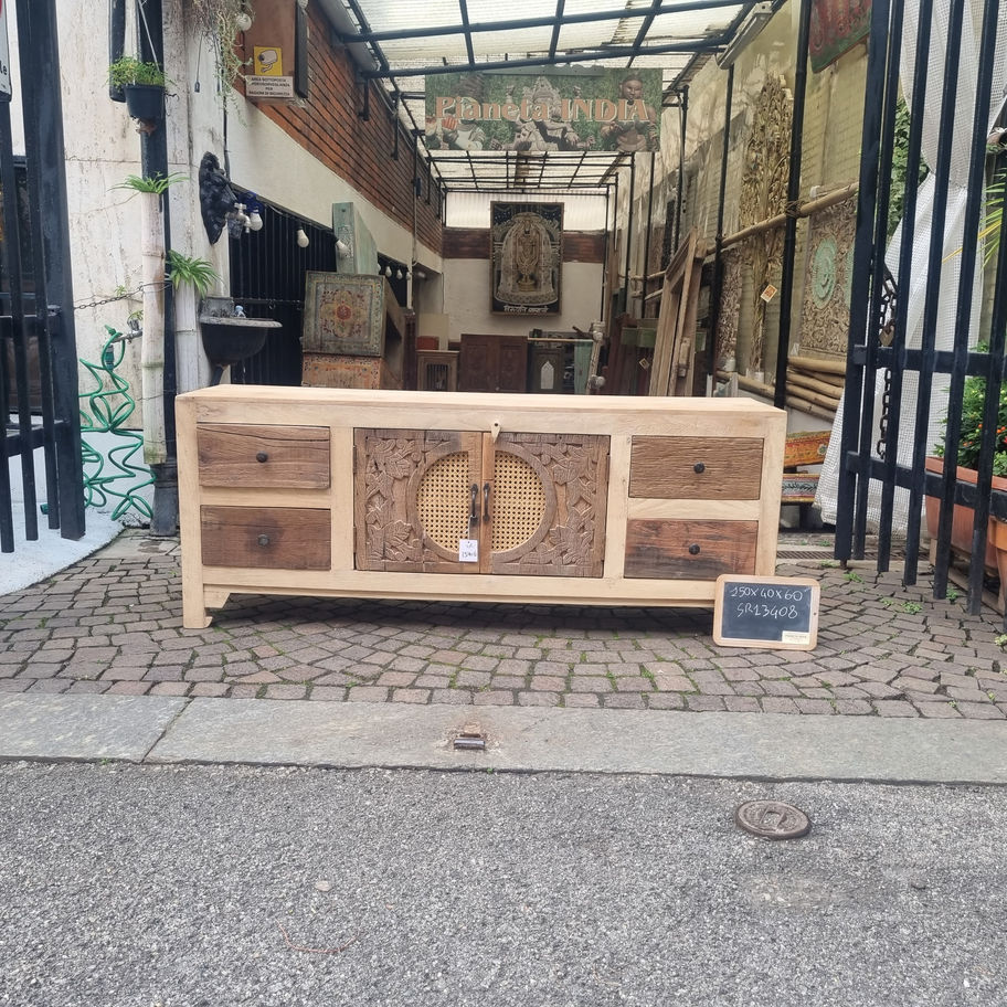 Splendido mobiletto porta tv in stile etnico indiano realizzata in legno massello naturale. Il mobile presenta una composizione armoniosa con due ante centrali decorate a mano con motivi geometrici e un inserto in rattan intrecciato, affiancate da cassetti su entrambi i lati per un'organizzazione pratica dello spazio. Dettagli artigianali e finiture naturali caratterizzano questo pezzo di grande impatto, perfetto per chi ricerca autenticità e qualità nelle proposte vintage e coloniali.