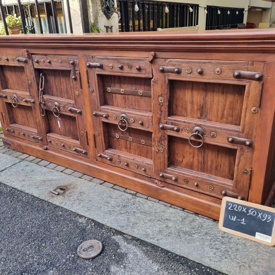 Credenza in legno massello dallo stile rustico e imponente, arricchita da dettagli in ferro battuto. Perfetta per arredamenti vintage, industriali o coloniali. Questa elegante credenza in legno di teak è un pezzo unico di grande fascino e robustezza. Il design richiama l'estetica tradizionale indiana, con ante lavorate a mano e impreziosite da applicazioni in ferro battuto, tra cui borchie decorative e maniglie ad anello. La struttura solida e le ampie dimensioni offrono un'elevata capacità di contenimento, rendendola ideale per soggiorni, sale da pranzo o spazi commerciali dal gusto retrò o industrial. Il legno naturale, con la sua finitura calda e autentica, dona un tocco di carattere a qualsiasi ambiente
