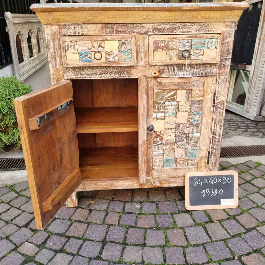 Mobile basso intarsiato in teak con ante e cassetto, decorazioni artigianali e finitura anticata. Questa credenza compatta è impreziosita da un patchwork di intarsi decorativi su ante e cassetto. Costruita in legno di teak, presenta una finitura anticata che esalta lo stile etnico. Ideale per piccoli spazi, corridoi o ambienti dal carattere artistico, unisce funzionalità a un’estetica autentica e calda.