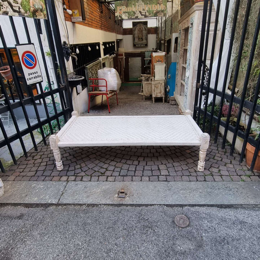 Lettino piu' grande artigianale \n \nOFFERTISSIMA - Charpai indiano - Tradizionale letto indiano “charpai” con struttura in legno massello e intreccio di corde colorate fatte a mano. Perfetto per arredare spazi interni ed esterni con un tocco etnico e autentico.