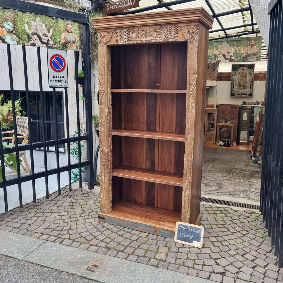 Elegante libreria in stile indiano realizzata in legno massello con una ricca cornice intagliata a motivi floreali. Quattro ripiani spaziosi offrono ampia capacità di esposizione per libri, oggetti d'arte e collezioni. Lo stile coloniale e i dettagli artigianali ne fanno un pezzo affascinante che aggiunge carattere e autenticità a qualsiasi ambiente.