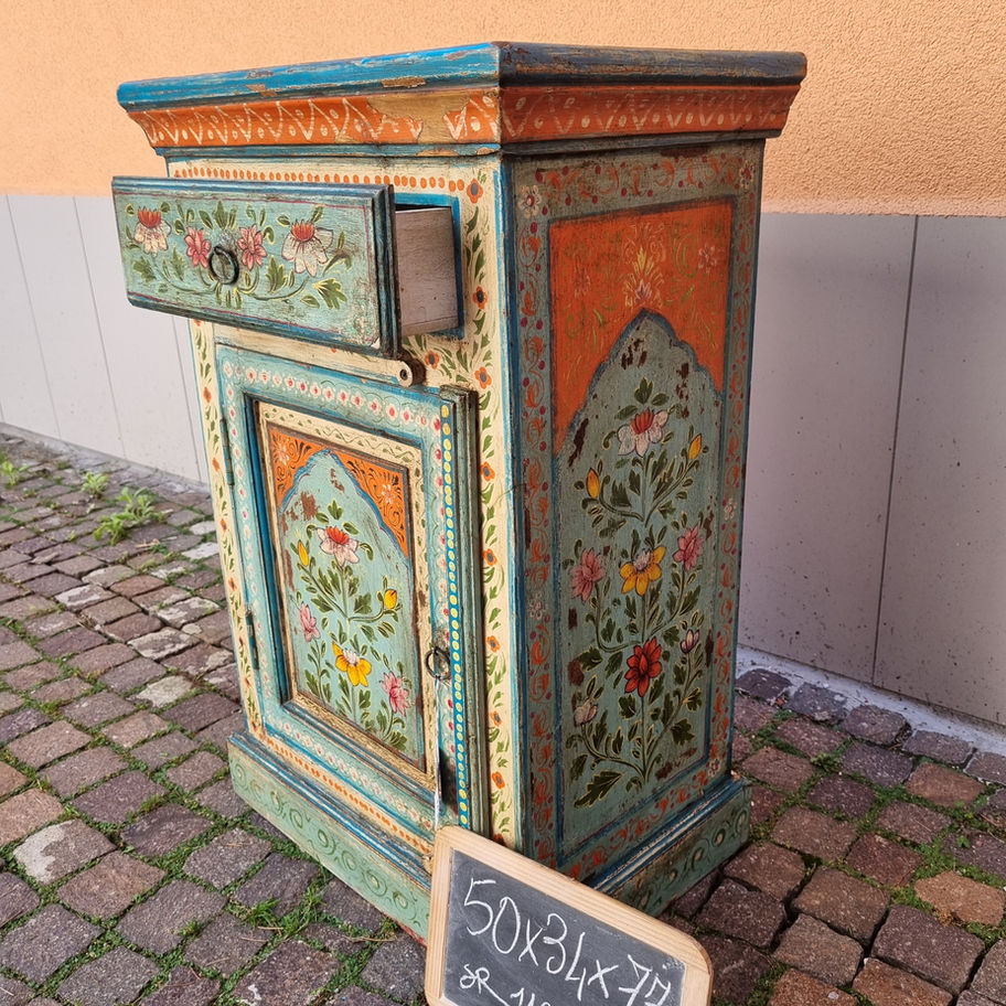 Raffinato mobiletto a colonna realizzato in pregiato legno di teak. Dotato di vani e cassetti, è ideale per ottimizzare lo spazio con eleganza e calore. Misure: 50X34X77 cm.