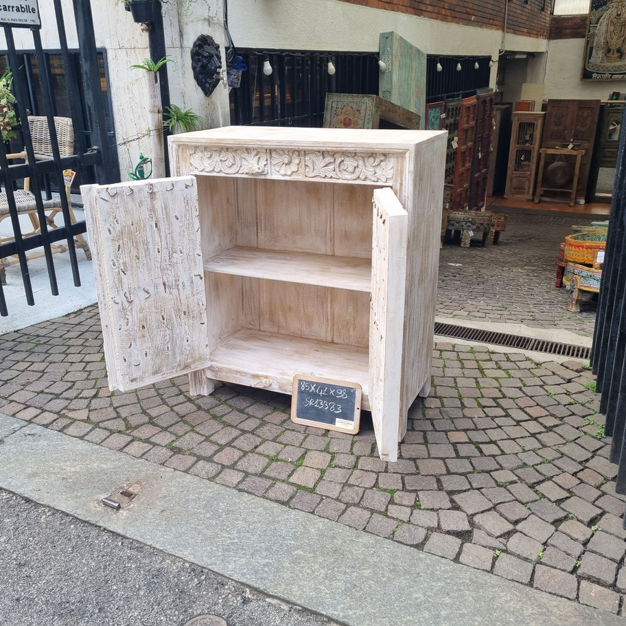 Affascinante mobiletto in stile vintage realizzato in legno naturale con finitura invecchiata. Caratterizzato da due ante munite di decorazioni intagliate e due ripiani interni funzionali, perfetto per aggiungere carattere e fascino retrò a qualsiasi ambiente. Le linee essenziali e i dettagli decorativi lo rendono ideale per arredamenti etnici e vintage.