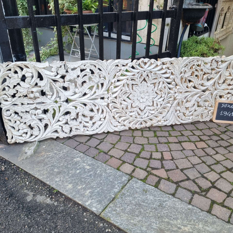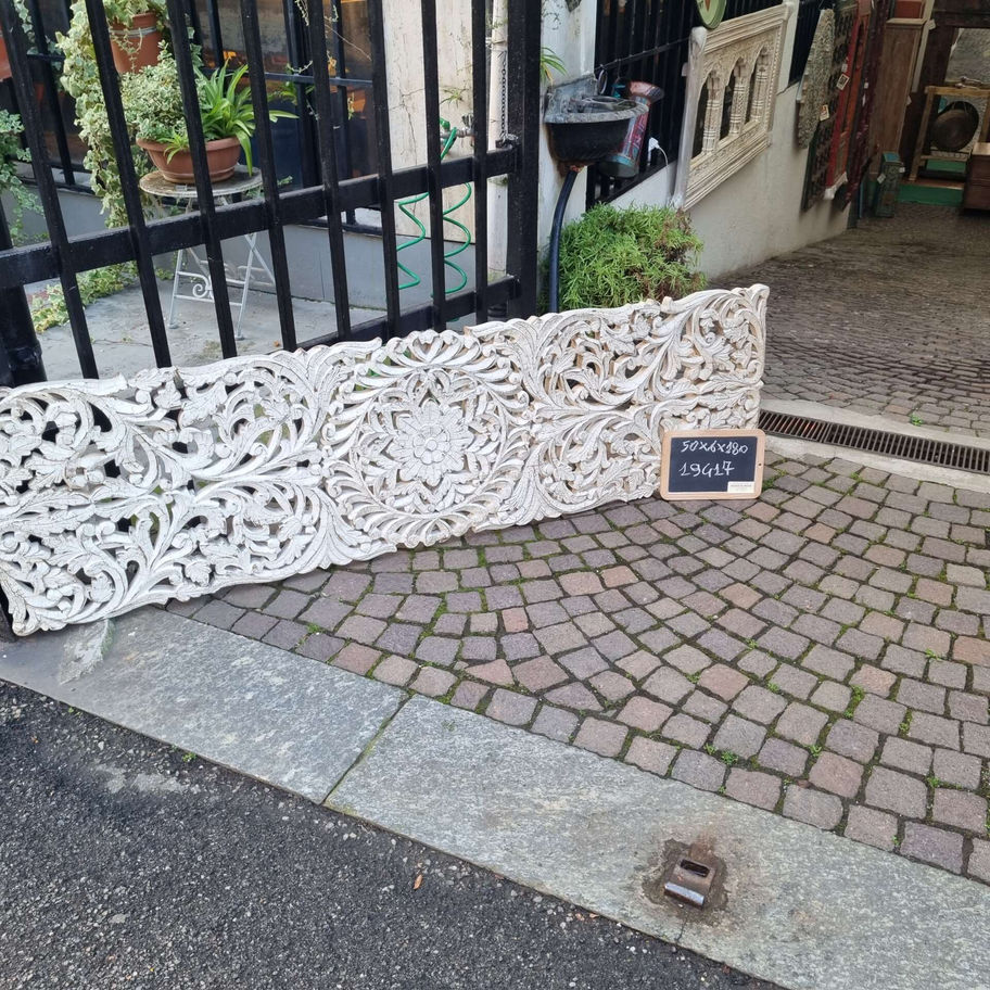 Pannello ornamentale a sviluppo orizzontale, caratterizzato da raffinati intagli floreali e un’elegante finitura decapata che dona un aspetto vintage e luminoso. Questo pannello decorativo, lungo circa 180 cm, si distingue per i suoi intricati motivi floreali intagliati che creano un effetto tridimensionale ricco di dettagli. La finitura decapata, in tonalità chiara, esalta l’elaborata lavorazione e conferisce al pezzo un fascino shabby-chic, perfetto per ambienti in stile etnico, boho o romantico. Grazie alla sua forma allungata, può essere appeso a parete come elemento d’arte, utilizzato come testiera del letto o collocato a terra per arricchire con un tocco di eleganza ogni spazio. Un complemento d’arredo ideale per chi cerca un pezzo scenografico e dal sapore artigianale.