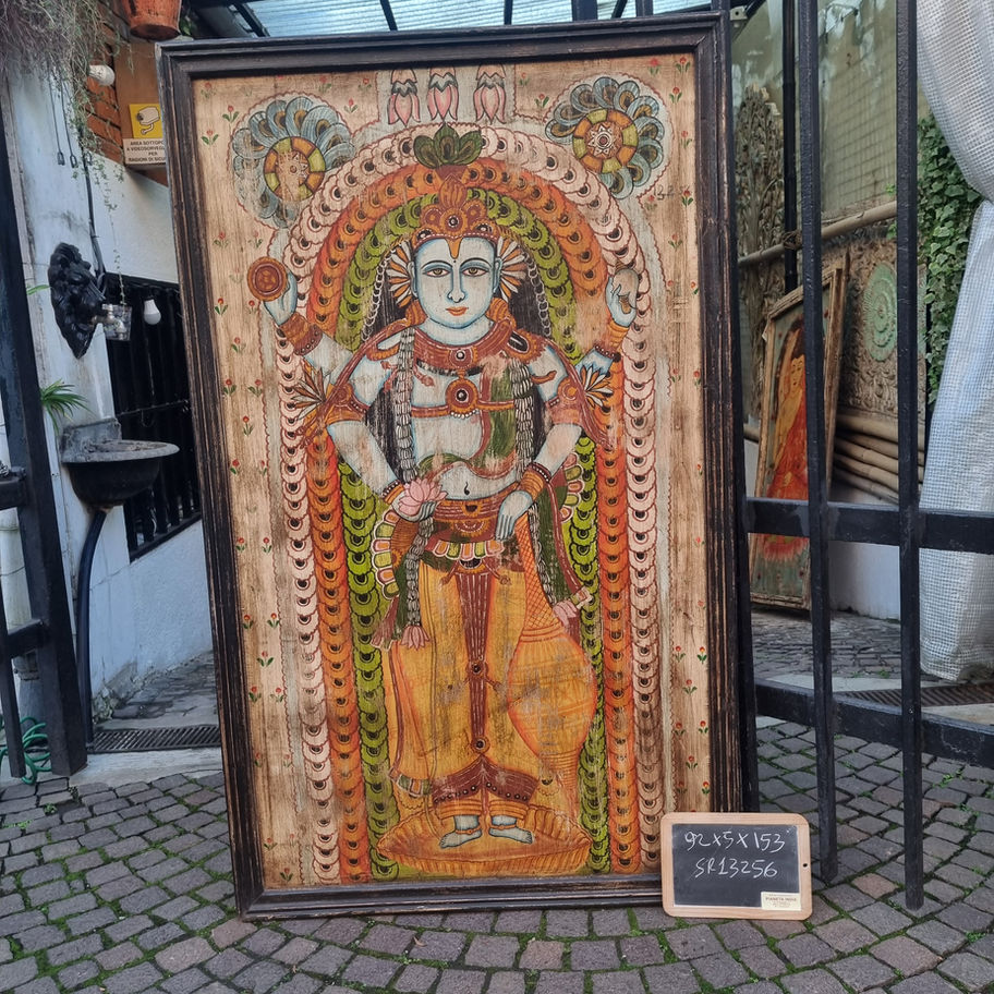 Straordinario pannello in legno massiccio con raffinata decorazione dipinta a mano in stile indiano tradizionale. La composizione presenta una divinità centrale circondata da motivi floreali geometrici in tonalità di rosso, verde, azzurro e oro su fondo naturale. Un'opera d'arte autentica che trasforma qualsiasi ambiente in uno spazio ricco di carattere etnico e spiritualità.