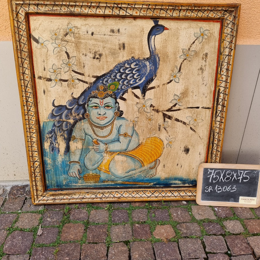 Quadro dipinto a mano che raffigura Krishna con pavone blu, caratteristico della tradizione artistica indiana. Decorato con dettagli dorati, fiori stilizzati e motivi floreali che conferiscono eleganza e autenticità. Perfetto per aggiungere un tocco etnico e spirituale a qualsiasi ambiente, questo pezzo vintage combina artigianalità tradizionale e bellezza senza tempo.