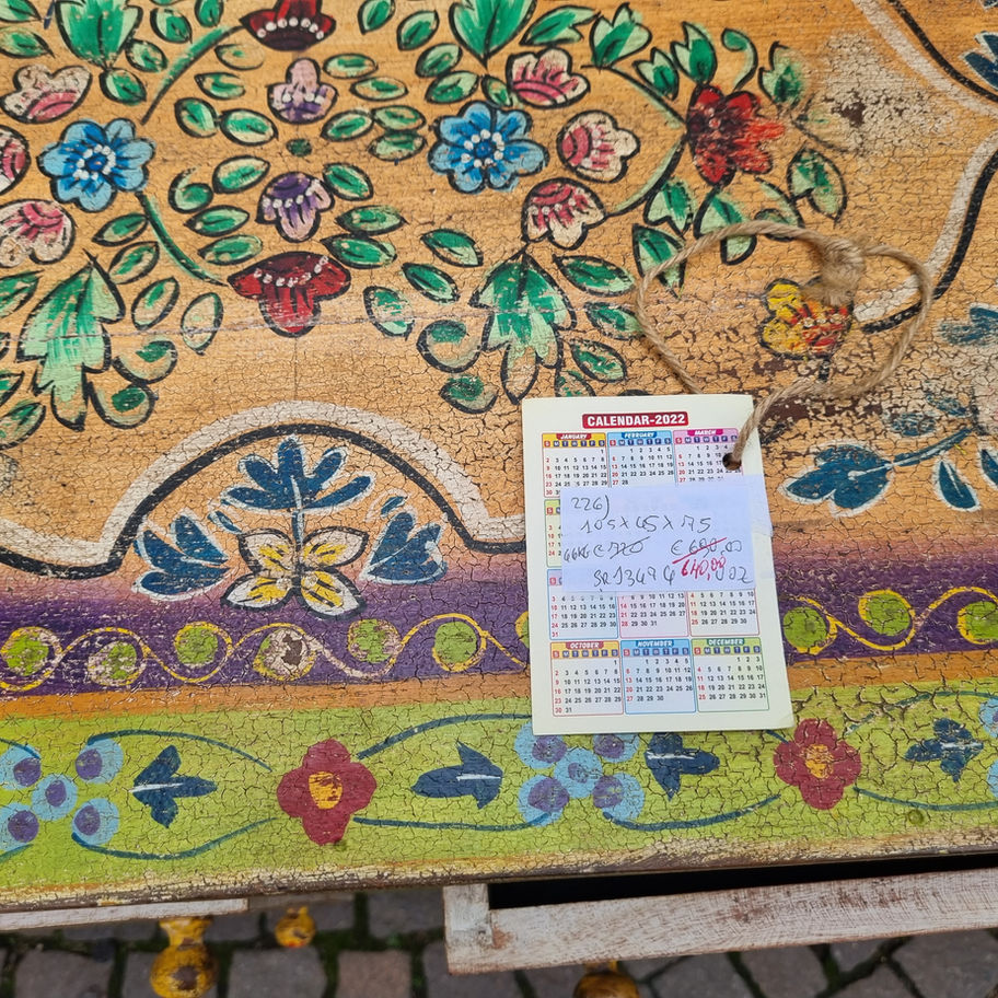 Affascinante mobiletto in stile indiano realizzato in legno, caratterizzato da pannelli decorativi dipinti a mano con motivi floreali tradizionali su fondo giallo e blu.Struttura solida e dettagli artigianali autentici.