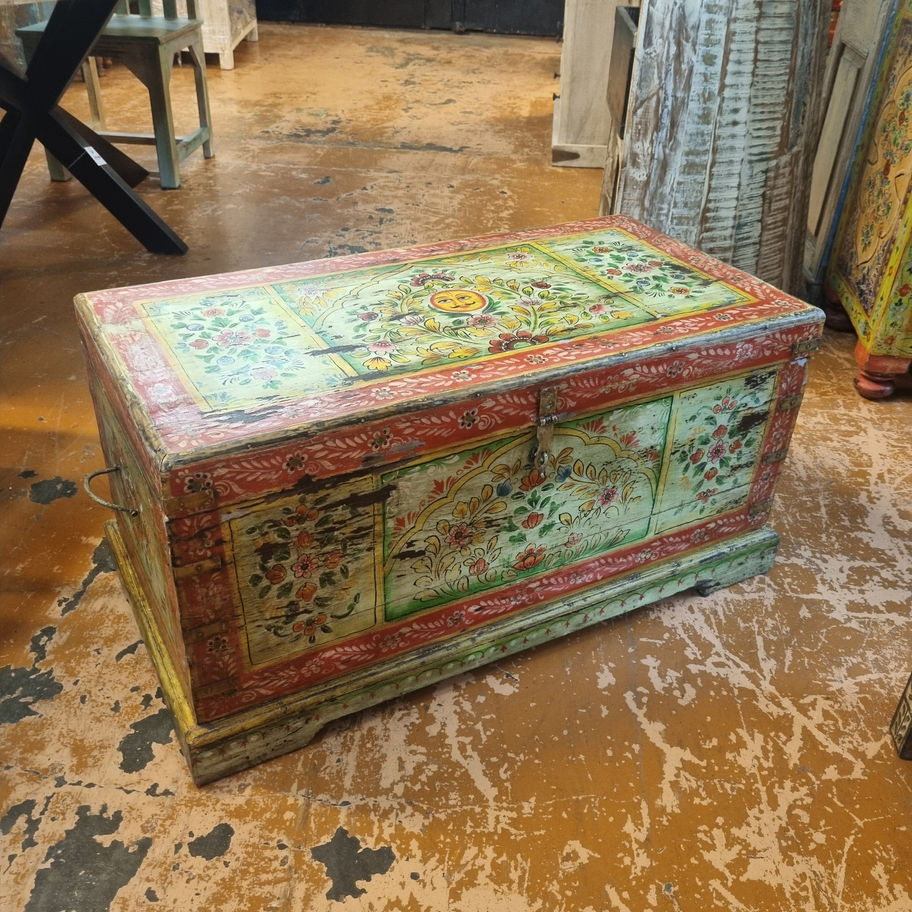 Suggestivo baule spazioso con decorazioni floreali. Realizzato in legno di teak