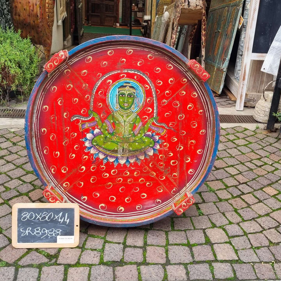 Tavolino tondo in teak decorato con una vivace pittura raffigurante una divinità indiana. Realizzato in legno di teak e decorato artigianalmente, questo tavolino tondo unisce funzionalità e arte. La superficie rossa accesa ospita una dettagliata pittura sacra, che dona al mobile un carattere esotico e spirituale. Perfetto come elemento centrale in ambienti etnici o eclettici.