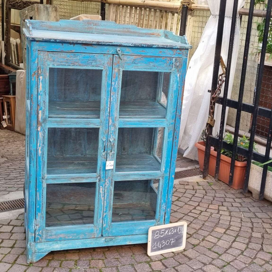 E' azzurra questa vecchia vetrinetta perfettamente conservata in ordine. Tutta in legno massello. Per riporre all'interno di tutto e di più.