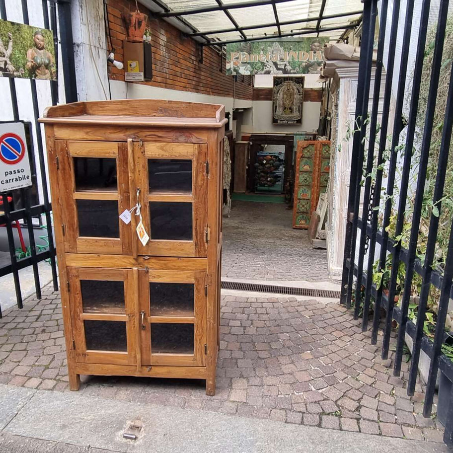 E’ la classica vetrina indiana questa in teak, con il bordino sulla parte superiore. E’ ben fatta, doppia apertura, superiore ed inferiore, con ripiani interni, una bella linea. La classica vetrina della nonna.