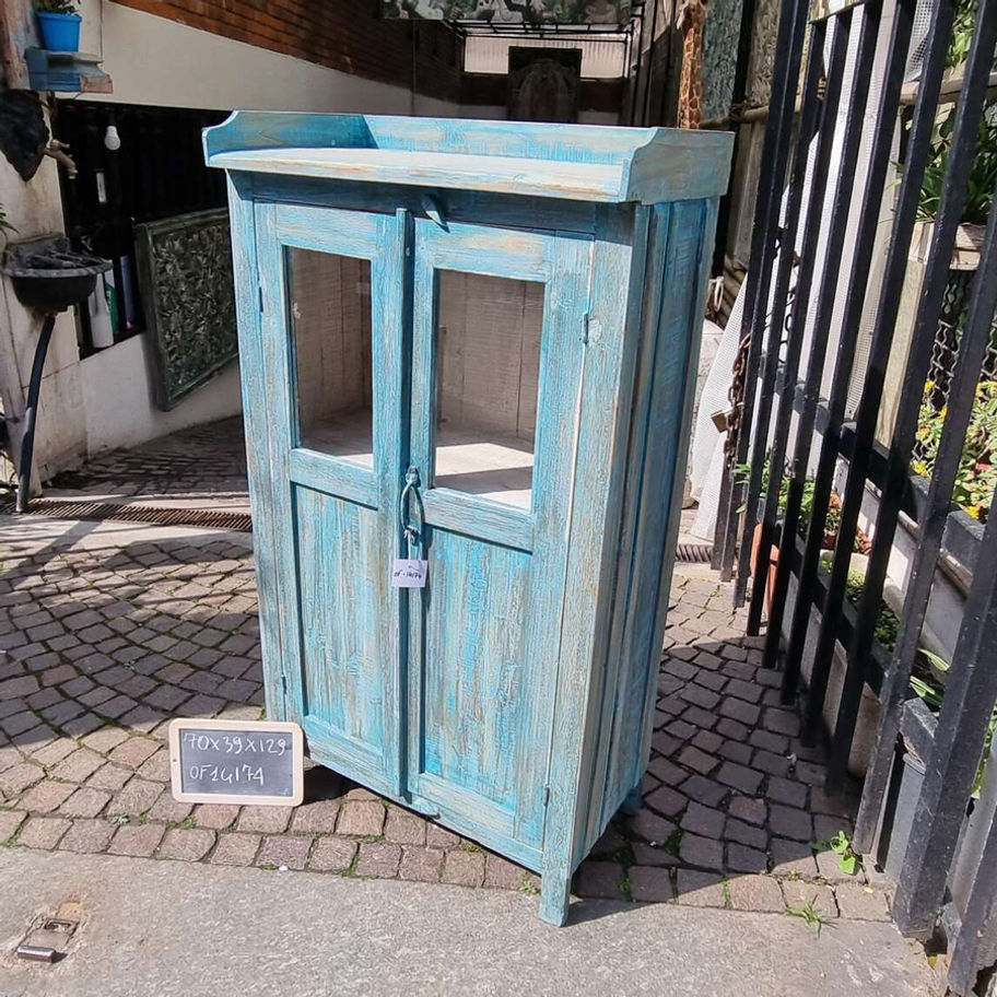 Deliziosa vetrinetta azzurra , con bordino, chiusa sotto . \n \nMisura 70X39X129 cm . Ha una media altezza ma e' molto capiente.