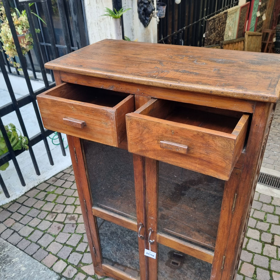 Elegante vetrinetta in stile coloniale realizzata in legno teak di pregevole fattura. Caratterizzata da ante a vetri che permettono di esporre collezioni e oggetti decorativi, con struttura robusta e dettagli classici. Perfetta per arredare salotti e studio con un tocco di autenticità vintage e raffinatezza etnica.
