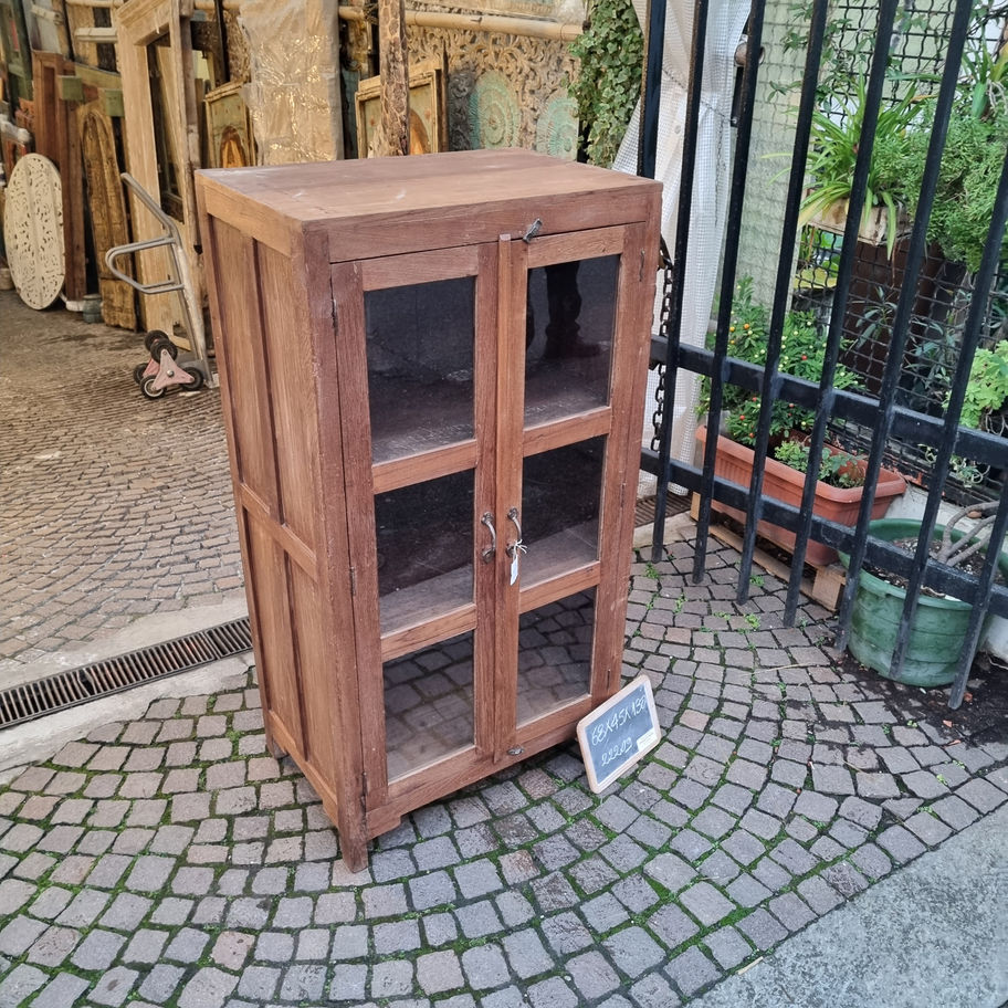 Elegante vetrinetta in stile coloniale realizzata in legno teak con finitura miele. Caratterizzata da due ante vetrate che permettono di esporre collezioni e oggetti preziosi, un cassetto superiore con chiusura in metallo e una base solida e robusta. Un pezzo versatile che combina funzionalità e charme vintage, perfetto per arredamenti etnici e classici.