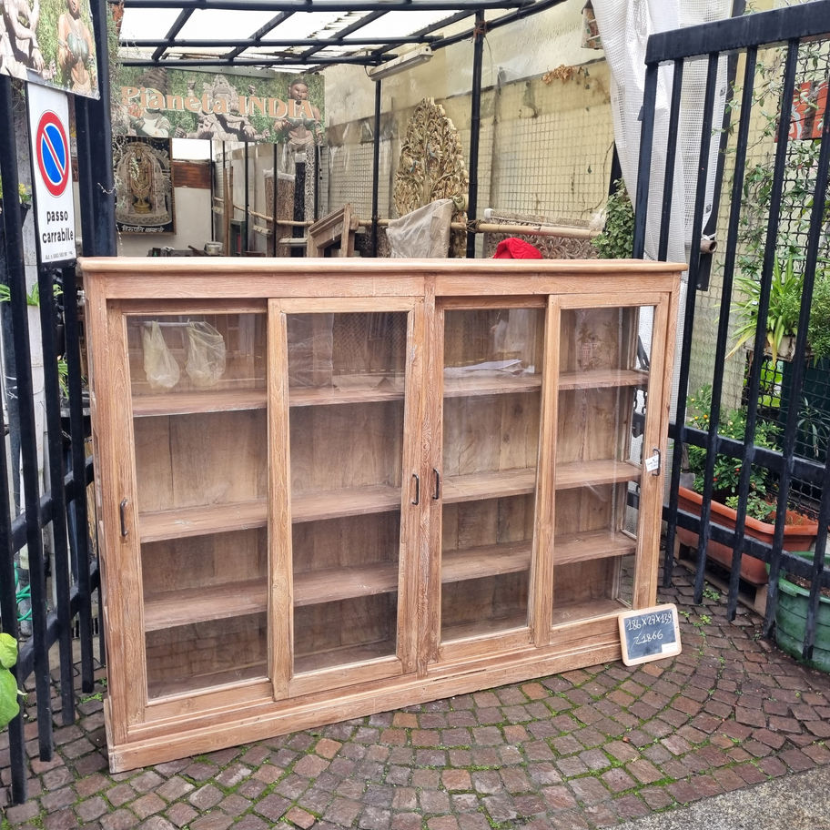 Elegante vetrina in stile coloniale realizzata in legno naturale, dotata di quattro ante a vetri che permettono di esporre con stile collezioni e oggetti preziosi. La struttura robusta e ben proporzionata si caratterizza per ripiani interni ampi e una finitura che esalta la venatura del legno, perfetta per chi ama l'arredamento etnico e vintage. Dimensioni: 186x27x139 cm.